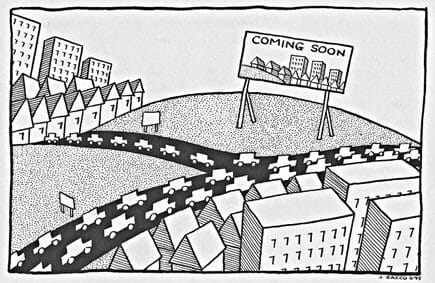 The “associations” whose prevalence de Tocqueville once marveled at have now become homeowner associations, another expression of what political scientist Evan McKenzie calls “privatopia”—the privately run and financed developments that make up most of Edge City housing. For Garreau, homeowner associations are innovative solutions to the problems of life on the frontier. A less charitable view would see them as an attempt to localize government so it only serves a small number of homogeneous residents; and, as they contract out for services, an attempt to render the city obsolete altogether. A letter in TECN from the chairman of an Atlanta Edge City coalition exemplifies this: “Seventy-five chief executive officers of major firms joined together (paying annual dues of $5,000 each) to substitute for and supplement governmental actions affecting quality of life … funding equipment needs for mall policing, lobbying for improved roadway access, providing support for the public high school, marketing the community through an annual guide book….”