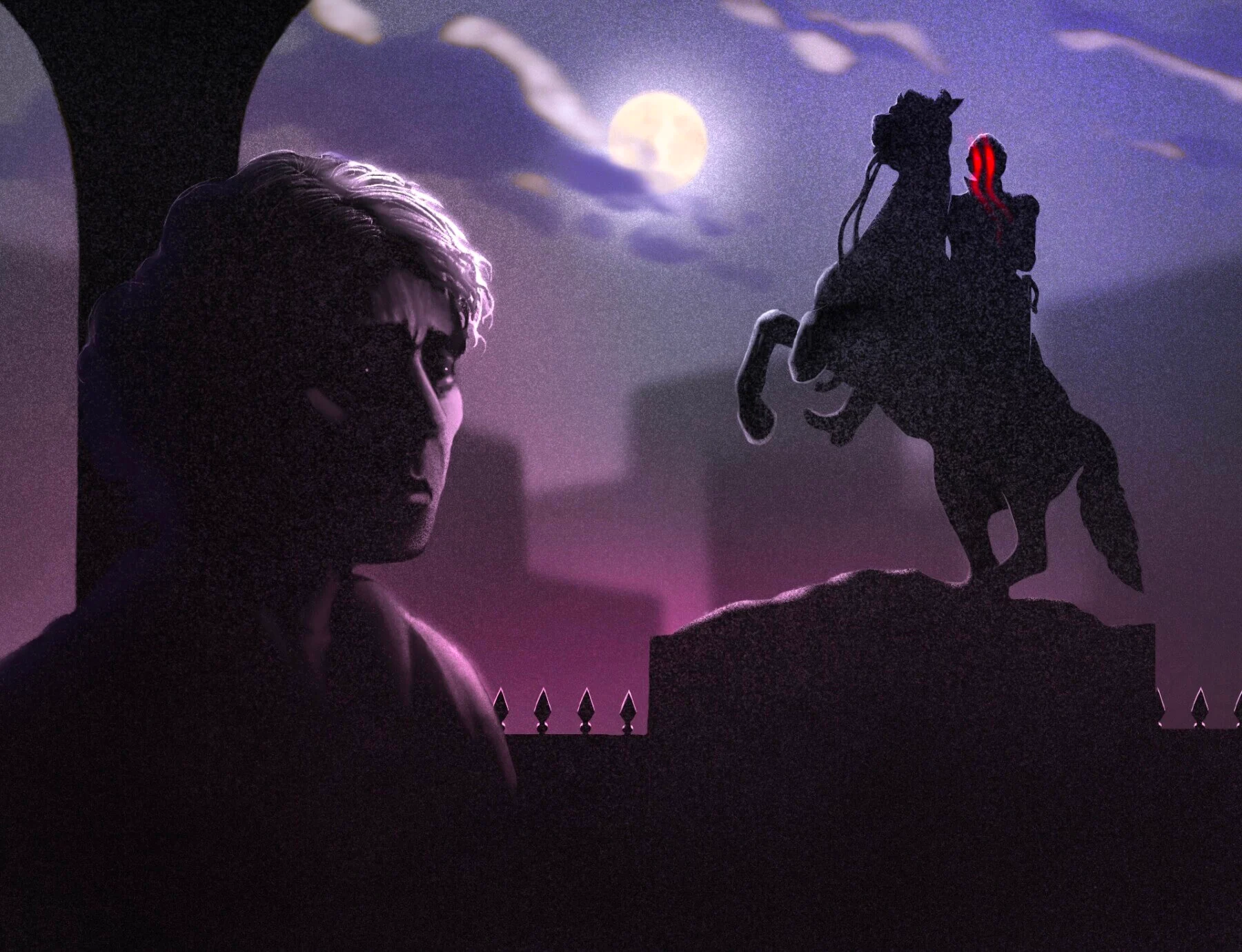 That night, beneath the pedestal, Ophelia gets to see it happen. In the statue’s left shoulder, it starts as a tremor, flowing down to the hand with the horse’s lead in it, its fingers flexing powerfully around the dangling leather strap. The arm that holds the hat comes next, creaking with strain as it falls to his waist. The benevolent, sightless eyes blink closed, then open again, looking down on Ophelia, who gasps with wonder, hand to heart. It is more wonderful than she ever imagined—