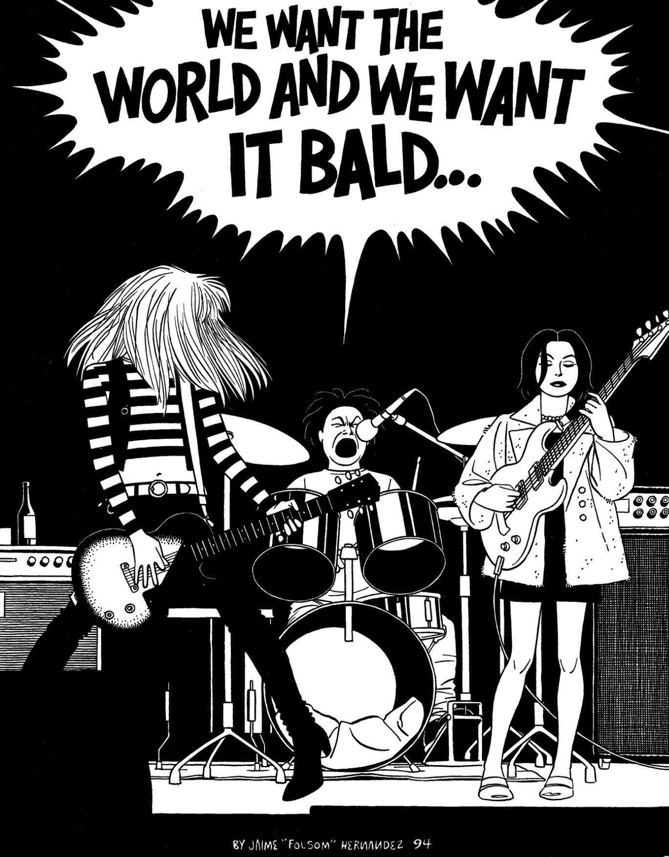 “Vida Loca: The Death of Speedy Ortiz,” probably the narrative and illustrative highlight of this era of Locas, ends starkly, with what’s likely (though not definitively) a suicide depicted with a sequence of pages rendered almost totally in black, save for a police cruiser’s headlights. But the next story, “The Night Ape Sex Came Home to Play,” is a total tonal one-eighty, with a bunch of underage kids trying to score liquor and sneak into a punk show. The formalist attention to page composition disappears with the narrative weight—despite the moody, cinematic style Jaime had honed in the stories preceding it, “Ape Sex” looks like a newspaper strip, with balloons of chatty jokes filling the top half of panels and characters pantomiming their feelings in the bottoms.