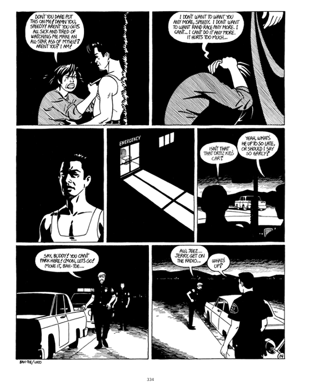 The sequence of stories beginning with “The Return of Ray D” is where Locas truly hits its stride. In a series of shorts depicting Maggie and Hopey’s misadventures couch surfing after getting kicked out of their last apartment, tensions are running high between las locas. Hopey, as if to prove just how free-spirited she can be, abruptly leaves Hoppers to go on tour with Terry’s (her ex’s) band without leaving so much as a note for Maggie. It’s the closest thing she can muster to a breakup. While Hopey is crisscrossing the country, Maggie, in Hoppers, ends up involved with two men resurfaced from her past: the charmingly bummy artist Ray Dominguez and the gangbanger Speedy Ortiz.