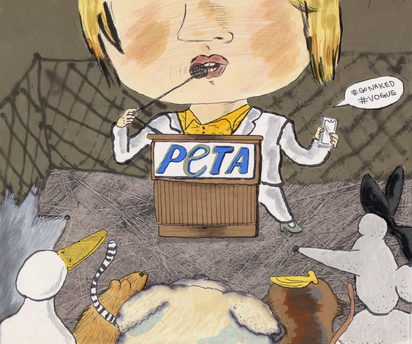 Dan Mathews, PETA’s former senior vice president, channeled this insight into many of the organization’s signature campaigns. Eschewing what he called the “dreary” route of more conventional activism, Mathews once distributed leaflets depicting dismembered animal figurines to children entering fast-food chains. He also persuaded Pamela Anderson, Naomi Campbell, and Cindy Crawford to go nearly nude for the aforementioned “I’d Rather Go Naked than Wear Fur” campaign and spray-painted kills animals onto a Calvin Klein logo. (Mathews later charmed Klein into a meeting, and the two became friendly.) “I’m from the generation that knows that a lot of people aren’t even watching the news anymore,” he told Alec Baldwin in a 2013 podcast. “There was cable, then there was the internet. There’s so much competition for people’s attention. . . . That’s what PETA is all about. We’re here to show you things you really don’t want to see.”