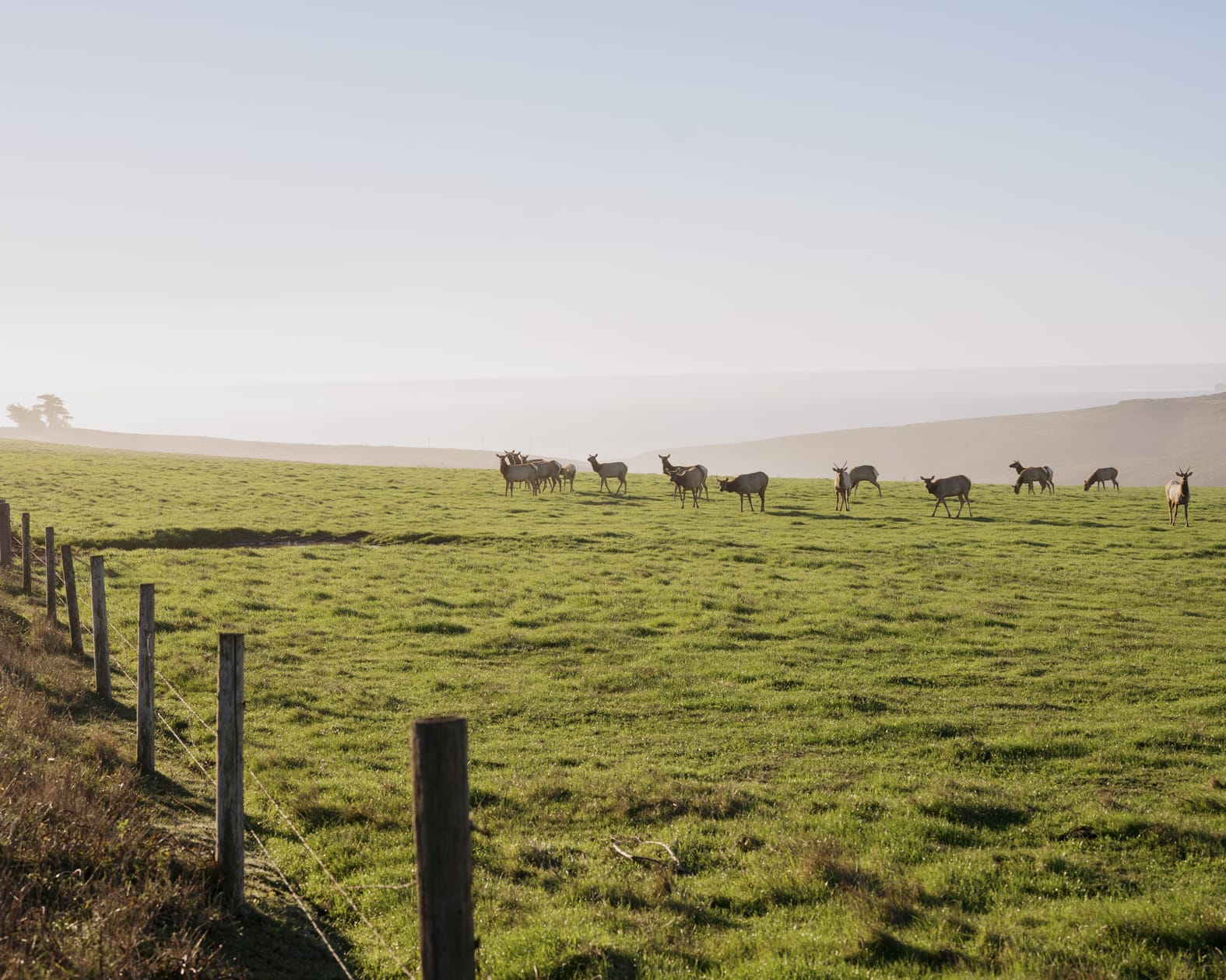 In contrast to the moments of frustration and hopelessness he’d just told me about feeling in the years leading up to this point, his happiness now suddenly struck me as yet another sign of change in the park—though, perhaps, not as dramatic of a change as the one he was about to show me. Parking the Tesla and rolling the car’s windows down, he instructed me to look outside, pointing into the thick mist. I could make out a two-tone field. On one side, the grass was uniform, short and brown; on the other, the earth was wild and varied, a swirl of tall grasses and thickets of coyote brush. Down the middle was an eight-foot-tall wall of mesh tethered by hefty wooden posts: the elk fence. Cutrano beamed as he pointed toward a portion of the fence that had been removed, leaving the entire park open for the elk to roam. The rest, he said, would soon be dismantled.