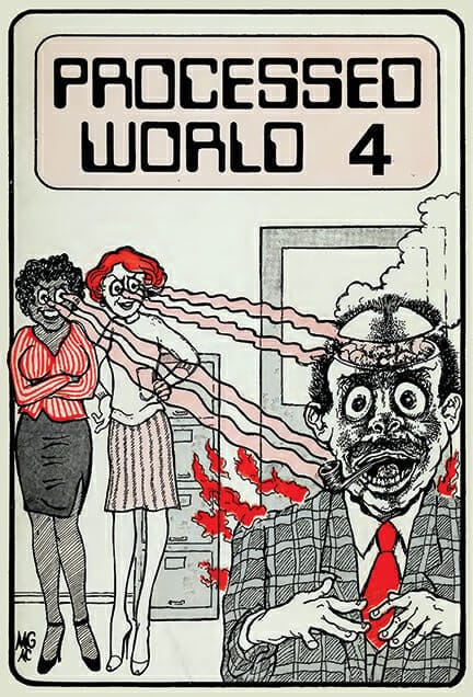 To grasp how deeply such patterns are rooted within the twenty-first century workplace, it’s important not to look forward, as the hucksters of digital capitalism are forever urging us to. (Stare long enough at the futurist mirage and you might forget that you blew your department’s slush fund on a Jeff Jarvis lecture.) Instead, let us travel backward in time, to the very cusp of the Information Revolution. Amid the first stirrings of dissent in Northern California, long before tech moguls were granted the dubious prestige of celebrity, a leaderless collective of disenchanted office workers put out a subversive periodical—a magazine called Processed World. First published in San Francisco in April 1981, the magazine now serves as an invaluable repository of all the mistaken, venal, and authoritarian guiding assumptions of the great digital reorganization of work. The brain trust behind Processed World was composed of people—many of them steeped in radical causes, environmental activism, and Situationist-type affairs—who began to identify the features of today’s high-productivity, low-content corporate workplace. Standing on the frontier of the new Information Economy, they took stock of their working lives and despaired at what they saw—and they made special, mordant note of the new technologies that didn’t make their work lives any easier or more meaningful.